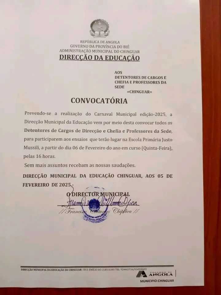 A Direcção Municipal da Educação do Chinguar, na província do Bié, está a obrigar professores e detentores de cargos de direcção e chefia a participar nos ensaios da dança de Carnaval 2025, que terá lugar nos dias 3 e 4 de Março, soube o Imparcial Press.