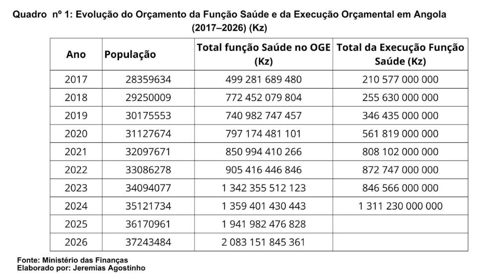 Mais do que um simples cálculo orçamental, este valor serve de ponto de partida para compreender até que ponto o investimento público em saúde está alinhado com as necessidades reais da população angolana (Quadro nº 1).