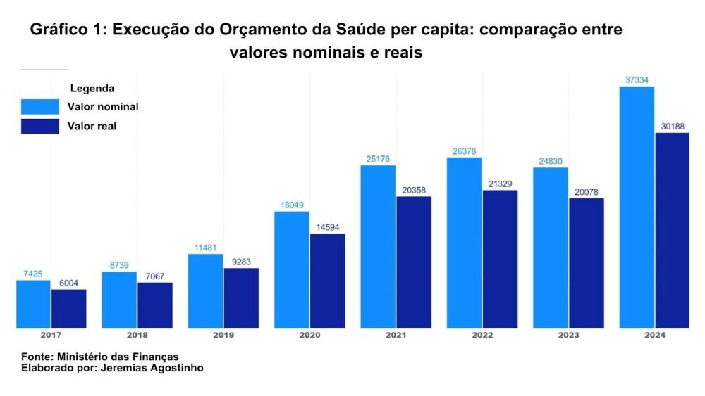 Quando observamos os valores nominais executados (Gráfico 1), nota-se um crescimento relativamente consistente, passando de cerca de 7.425 kwanzas per capita em 2017 para 37.334 kwanzas em 2024.