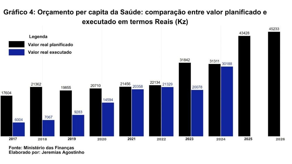 A análise comparada dos valores planificados e executados do Orçamento Geral do Estado (OGE) para a Saúde per capita em Angola, entre 2017 e 2026, revela um padrão estrutural que ajuda a explicar muitos dos constrangimentos crónicos do sistema nacional de saúde.