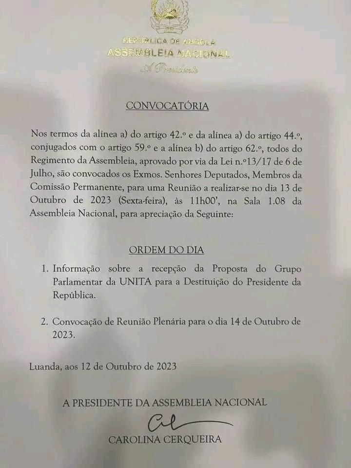 A Comissão Permanente da Assembleia Nacional (AN) reúne-se, esta sexta-feira, 13, para apreciar a proposta de destituição do Presidente da República, João Lourenço, formalizada pelo Grupo Parlamentar da UNITA.