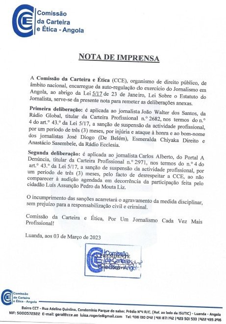 Já a suspensão aplicada ao jornalista João Walter dos Santos, da Rádio Global, aconteceu por “injúria e ataque à honra e ao bom-nome” dos jornalistas da Rádio Ecclésia, José Diogo (De Belém), Esmeralda Chiyaka Direito e Anastácio Sasembele.
