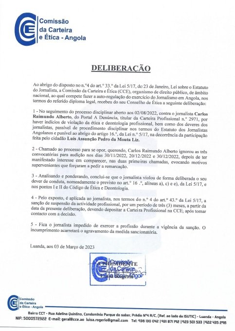 Consoante as deliberações da CCE, Carlos Alberto, do portal A Denúncia, foi sancionado com a suspensão da actividade profissional pelo facto de desrespeitar a CCE, ao não comparecer à audição no seguimento de um processo disciplinar aberto em Agosto de 2022, por indícios de violação da ética e deontologia profissional, bem como dos deveres dos jornalistas.
