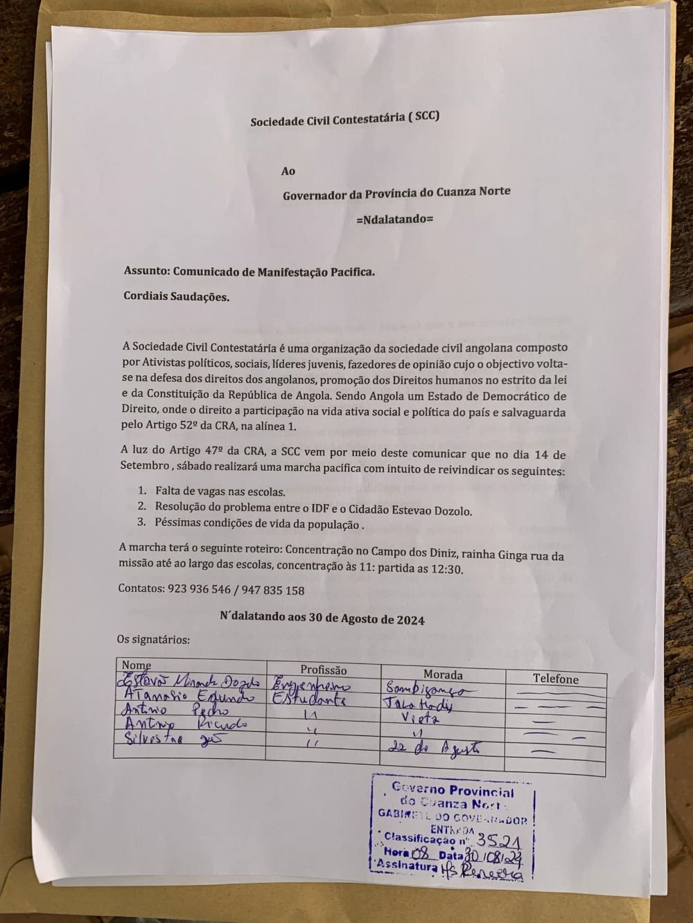 Em resposta a esta situação e a outros problemas similares, a Sociedade Civil Contestatária (SCC) na província está a organizar uma manifestação pacífica. Segundo um documento obtido pelo Imparcial Press, a manifestação está marcada para 14 de Setembro.