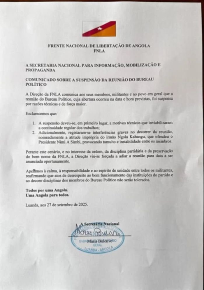 Contudo, informações internas revelam que o verdadeiro motivo do cancelamento foi a escalada de tensões e conflitos internos durante o encontro, que chegaram ao ponto de culminar na expulsão do presidente do partido, Nimi a Simbi, da sala de reuniões, por parte de membros do Bureau Político.