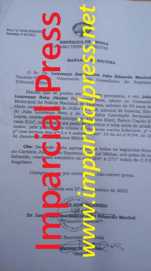 Segundo as informações em posse do Imparcial Press, João Lourenço Neto Júnior, agora com 54 anos, foi estranhamente posto em liberdade provisória através do Mandado de Soltura n.º 02/2022, pelo juiz conselheiro do Supremo Tribunal Militar, tenente-general Lourenço dos Santos João Eduardo Machai, no dia 27 de Dezembro de 2022.