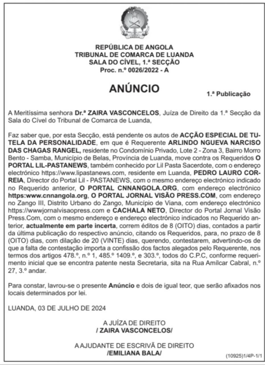 De acordo com um anúncio do Tribunal de Comarca de Luanda, datado de 3 de Julho do corrente ano e divulgado nas edições mais recentes do Jornal de Angola, os sites visados no processo são: Lil Pasta News, dirigido por Pedro Lauro Correia; CNN Angola e Jornal Visão, que até no ano 2018 era dirigido por Caxala Neto.