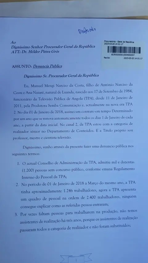 O realizador Manuel Mengi Narciso da Costa apresentou no passado dia 20 de Março, à Procuradoria Geral da República uma queixa contra o Conselho de Administração da Televisão Pública de Angola (TPA), por rescindir de forma arbitrária o seu contrato de trabalho, em violação da Lei Geral do Trabalho.